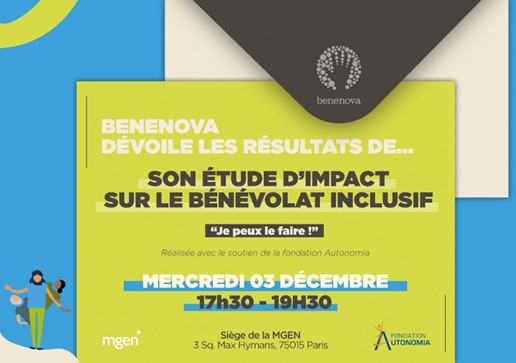 À l’occasion de la Journée internationale des personnes handicapées, nous vous invitons à une soirée de présentation de l’étude d’impact BENENOVA sur le bénévolat inclusif, réalisée par le cabinet EEXISTE avec au soutien de la Fondation Autonomia.